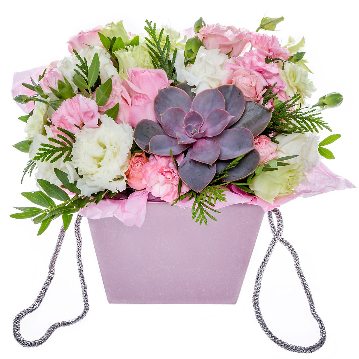 Суккулент, эустома белая и розовая, роза одноголовая розовая, туя, фисташка. Упаковка (шляпная коробка, квадратный бокс, коробка сердце, оазис)