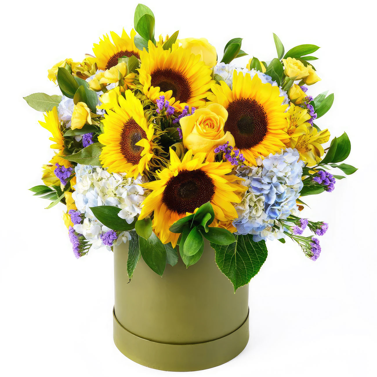 Подсолнух, гортензия голубая, роза одноголовая желтая, роза кустовая желтая, альстромерия желтая, статица. Упаковка (шляпная коробка, квадратный бокс, коробка сердце, оазис)