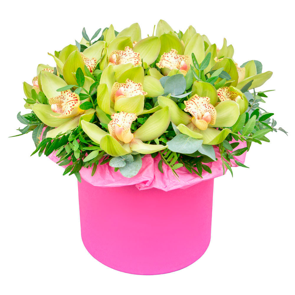 Орхидея желтая, фисташка. Упаковка (шляпная коробка, квадратный бокс, коробка сердце, оазис)