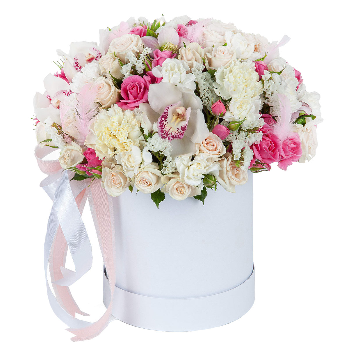 Орхидея белая, роза кустовая розовая и кремовая, гвоздика белая, статица белая, перья декоративные, лента. Упаковка (шляпная коробка, квадратный бокс, коробка сердце, оазис)