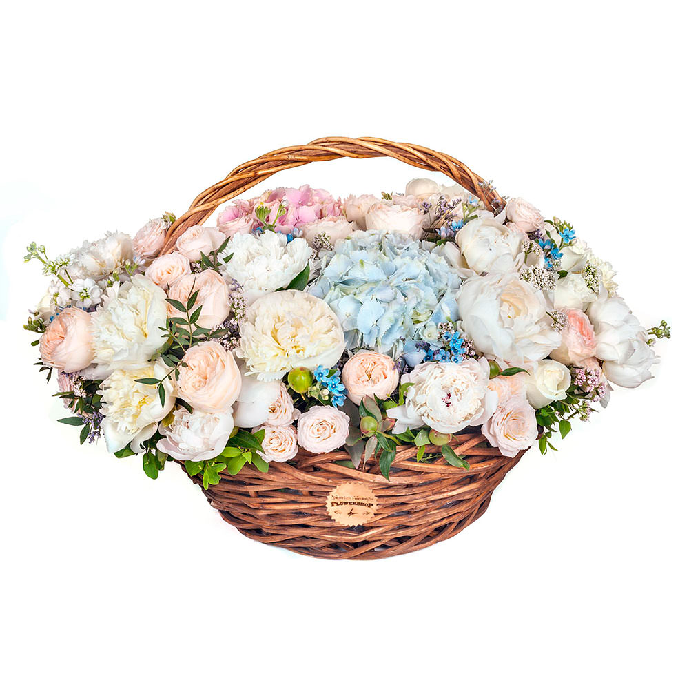 Оксипеталум, гортензия голубая и розовая, пион белая, роза кустовая кремовая, фисташка, ваксфлауэр, маттиола белый. Упаковка (Корзина, оазис).
