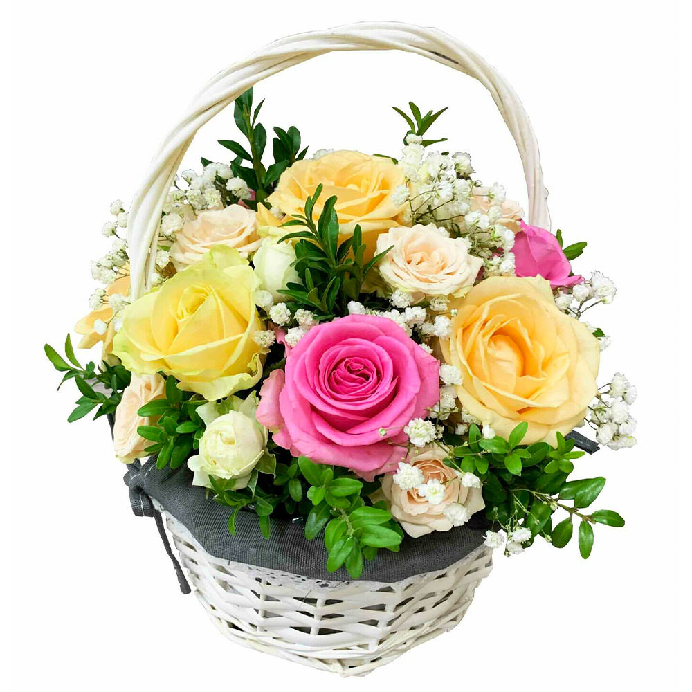 Роза одноголовая микс (желтая, розовая), гипсофила, фисташка. Упаковка (Корзина, оазис).